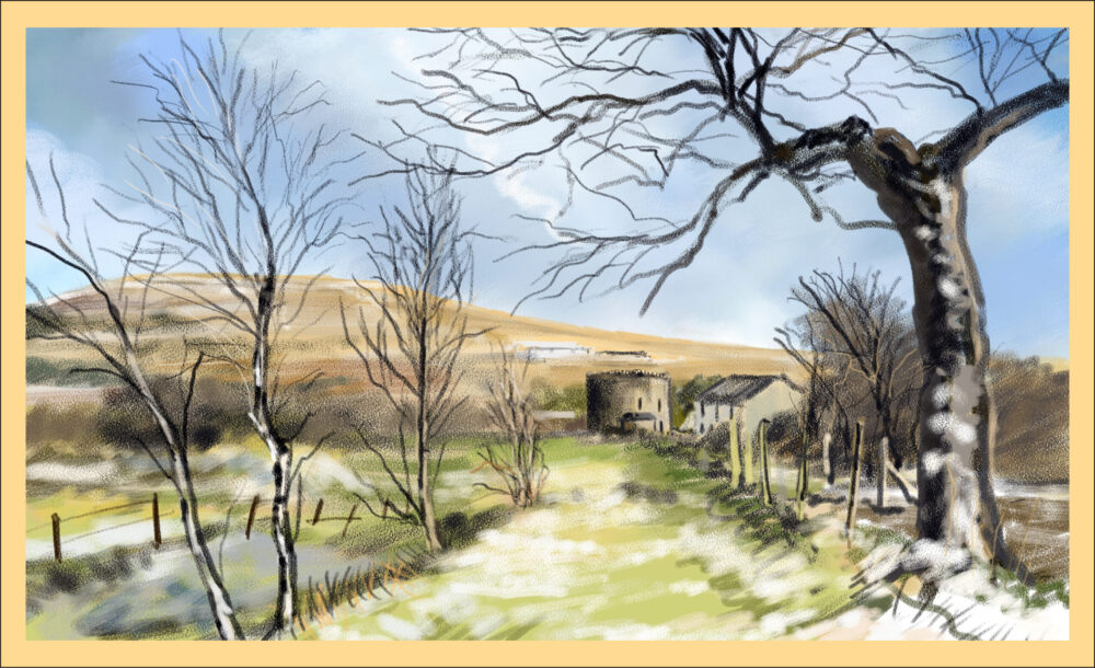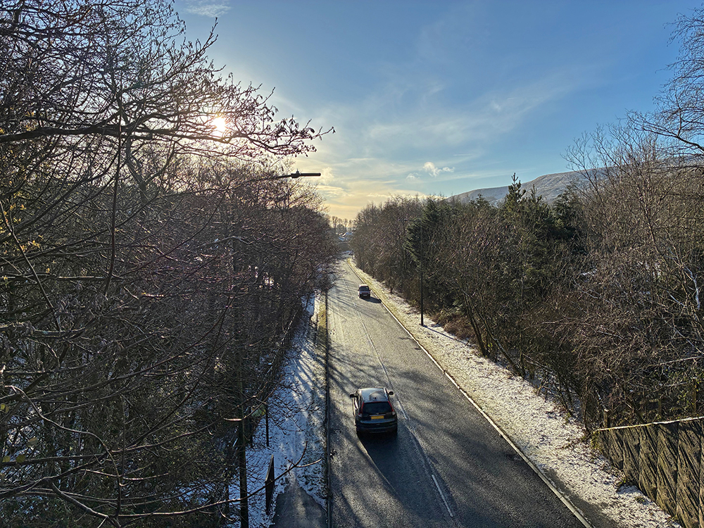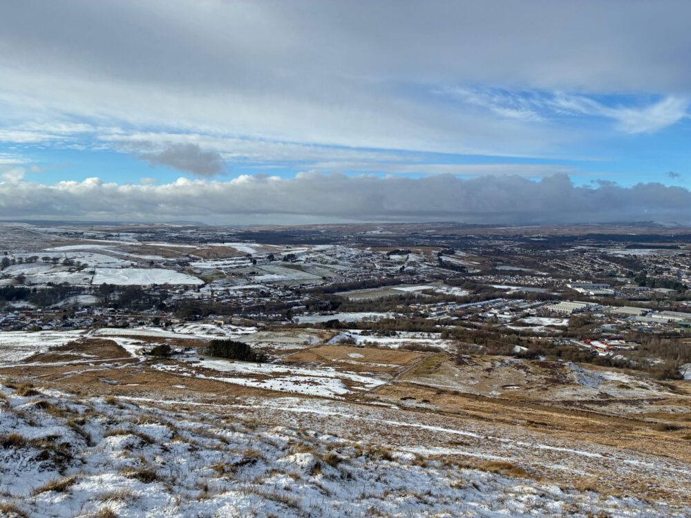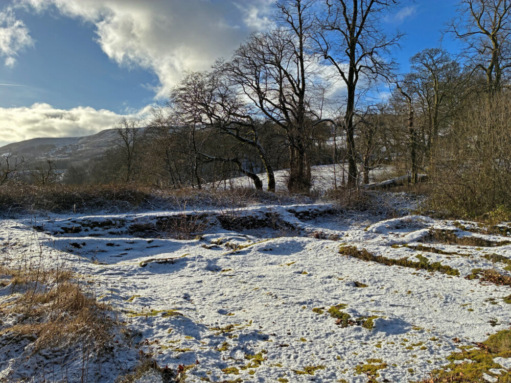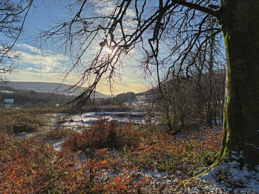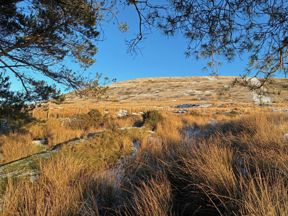 From a distance, Mulfran appears bare, but in reality, it is blanketed in ‘cwtch’ grass, rising from a sea of sparkling, frosty, crystalised snow just now, well at the time of writing. Perhaps, not everyone’s favourite, but beautiful in the glow of the setting sun.
