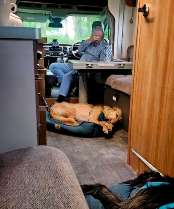 To access fridge, kettle, lounge, or loo, the cabin had to be solved. I’d step towards the kitchenette and squeeze Dog 1 under the table; Tim would toe-pivot and ease Dog 2 towards the lounge; Tim and Dog 2 would sit; I’d shimmy past; Tim would lurch, put Dog 2 in the bathroom… only for us to perform the entire exhausting routine again, in reverse.