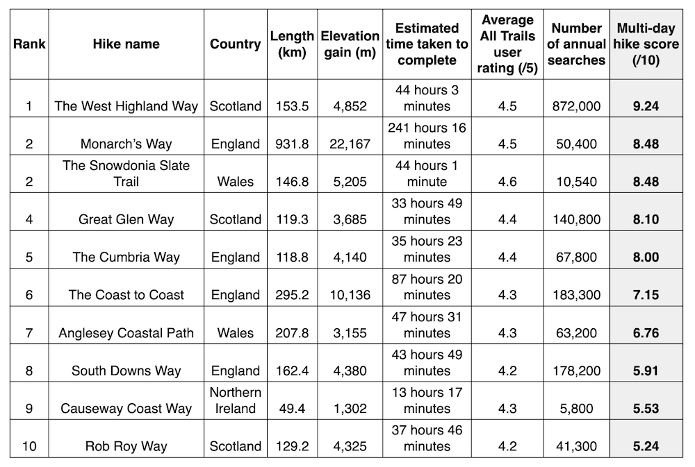 New research by outdoor specialists Blacks analysed average user rating and Google search popularity, to compile their top 10 best multi-day hikes – and two from Wales made the list.