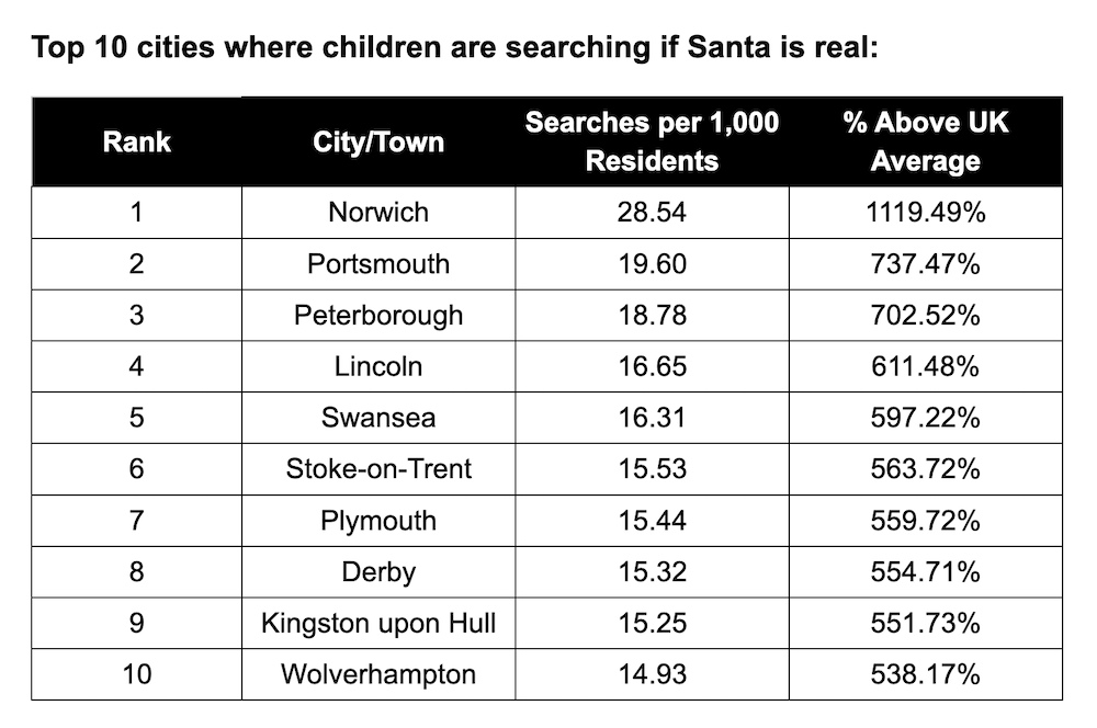 – Norwich is the city with the highest number of Google searches for whether Santa is real. That’s about 28-29 Santa-related Google searches for every 1,000 people living in Norwich. Searches are over 12 times the national search average.
