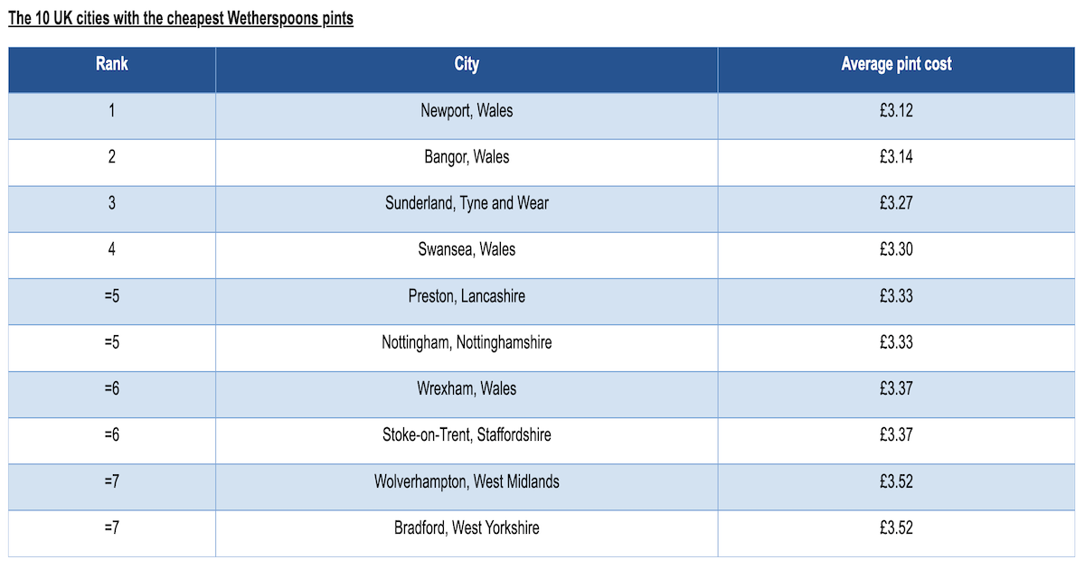 “Welsh cities appear four times in the ranking, including first and second place, despite having far fewer cities than England, highlighting just how affordable Wetherspoons pints are in Wales.