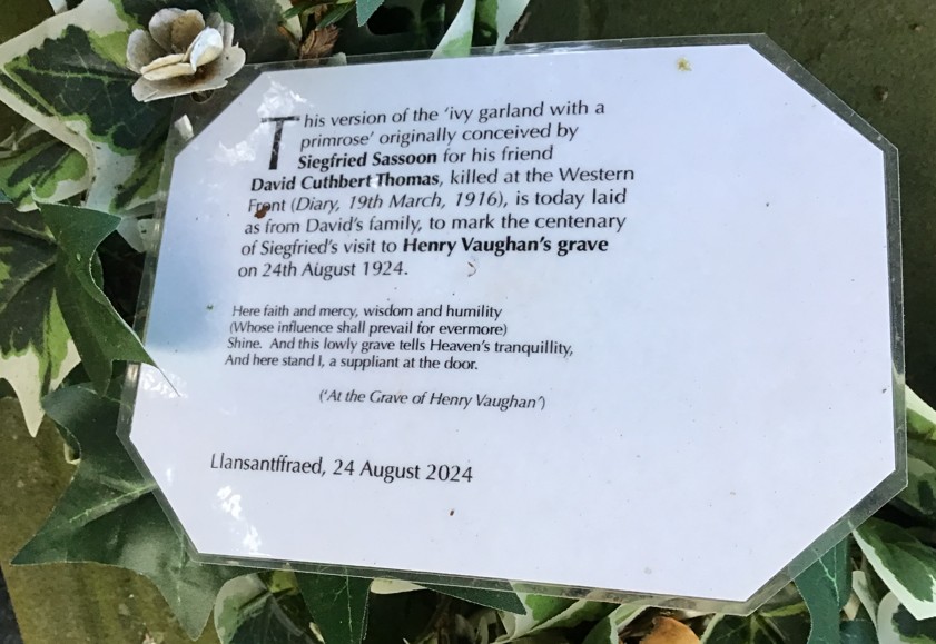 After the war, on 24 August 1924, Sassoon visited the grave of the great 17th century poet Henry Vaughan (1621–1695). He was drawn to the beauty of Vaughan’s poetry and his anti-war sentiments written during the British Civil War (1642-1651). The visit was commemorated in 2024 by Thomas’ family, the ivy reference taken from Sassoon’s diary entry.