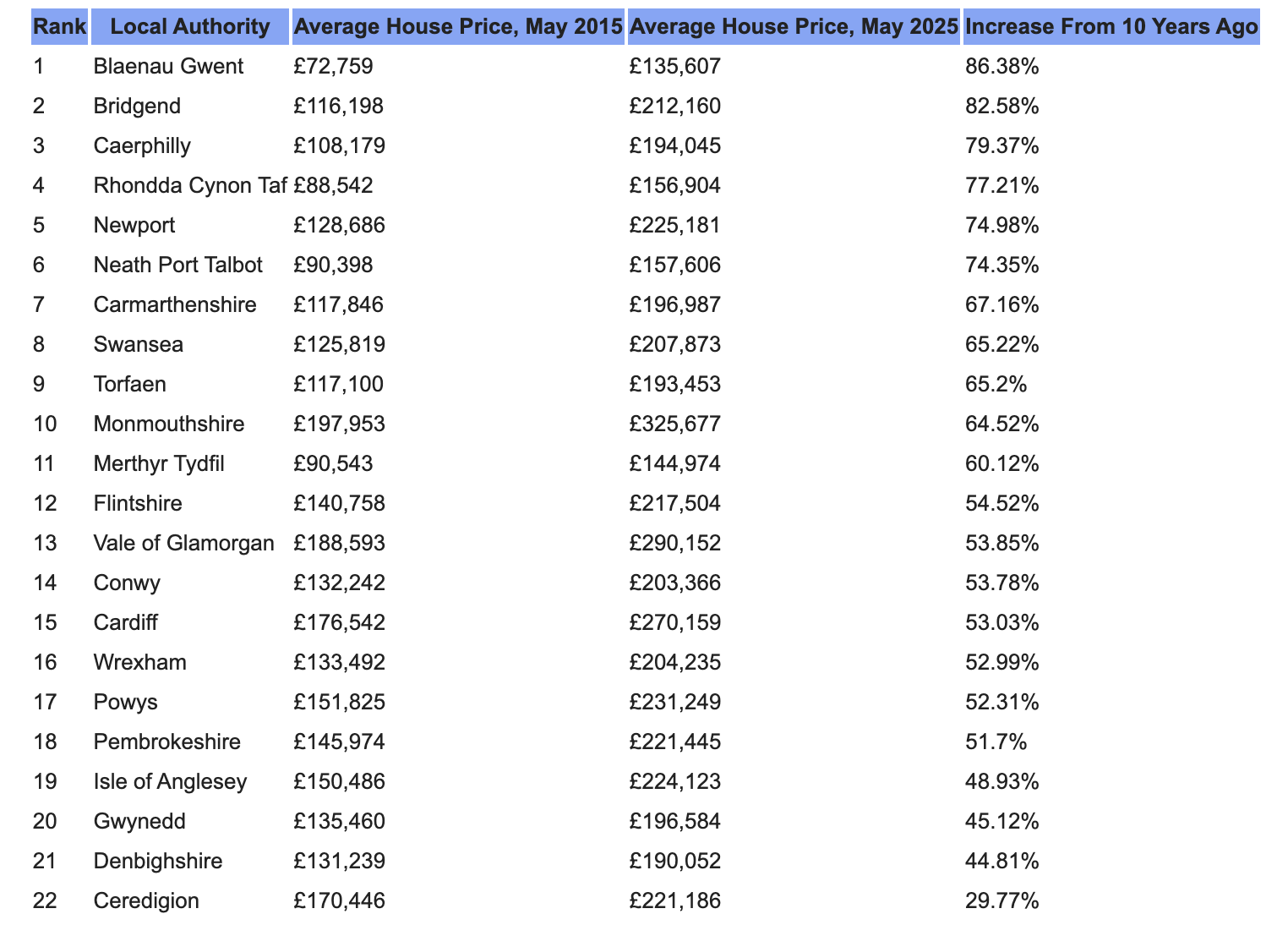 The study found that the average price of a house in the local authority in May 2025 was £135,607, compared to £72,759 in May 2015, representing a 86.38% increase. At a national level, Blaenau Gwent ranks 6th when comparing all local authority areas in the UK.