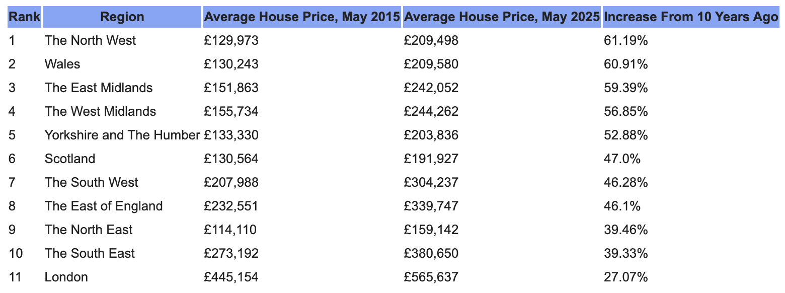 Comparing the 12 regions of the UK, The North West has seen the biggest increase in average house price over the past 10 years – 61.19% – going from £129,973 in May 2015, to £209,498 in May 2025.