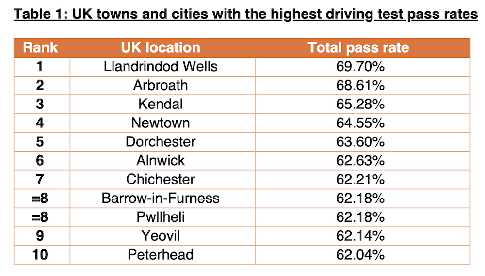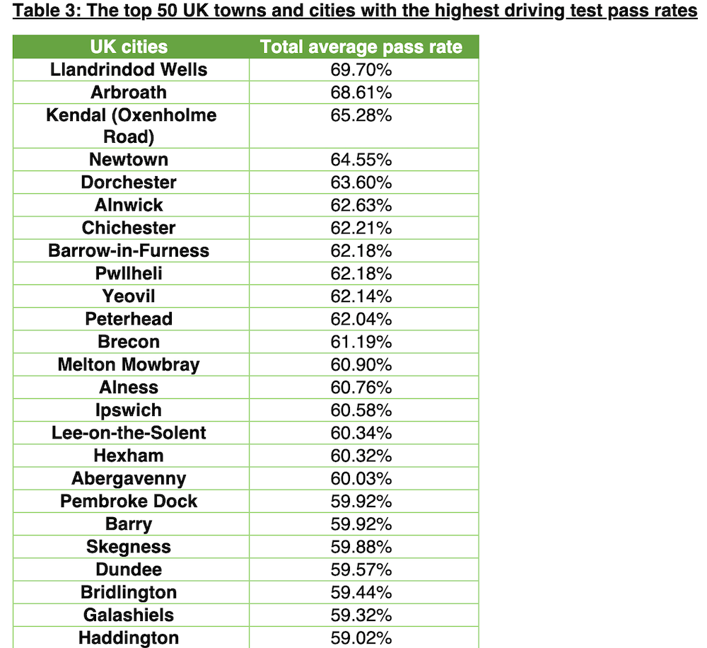 “Smaller, rural towns appear most often in the top rankings, including Wales’ Llandrindod Wells and Scotland’s Arbroath. In comparison, cities Wolverhampton and Plymouth rank as the two worst locations to learn to drive. These findings suggest lighter traffic and simpler road layouts may significantly boost candidates’ chances of passing their driving test.”