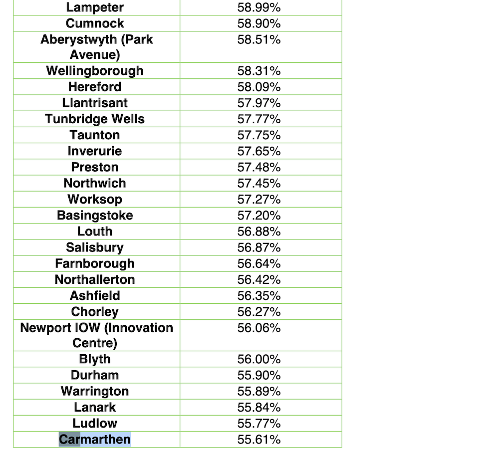 Another Welsh location, Newtown, ranks fourth. The location has a total pass rate of 64.55%, which is 20.8% above the national average. Women lead the way with a 64.91% pass rate in the Welsh town, compared to 64.22% for men.