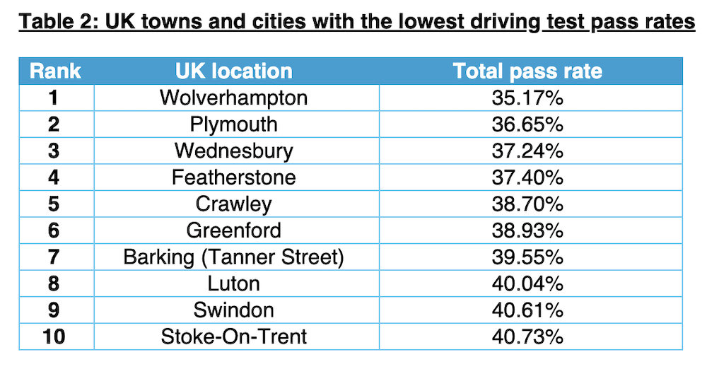 Wednesbury and Featherstone rank third and fourth, with a pass rate of 37.24% and 37.40% respectively. Crawley has the fifth lowest driving test pass rate amongst all UK towns and cities, according to the study, at 38.7%.