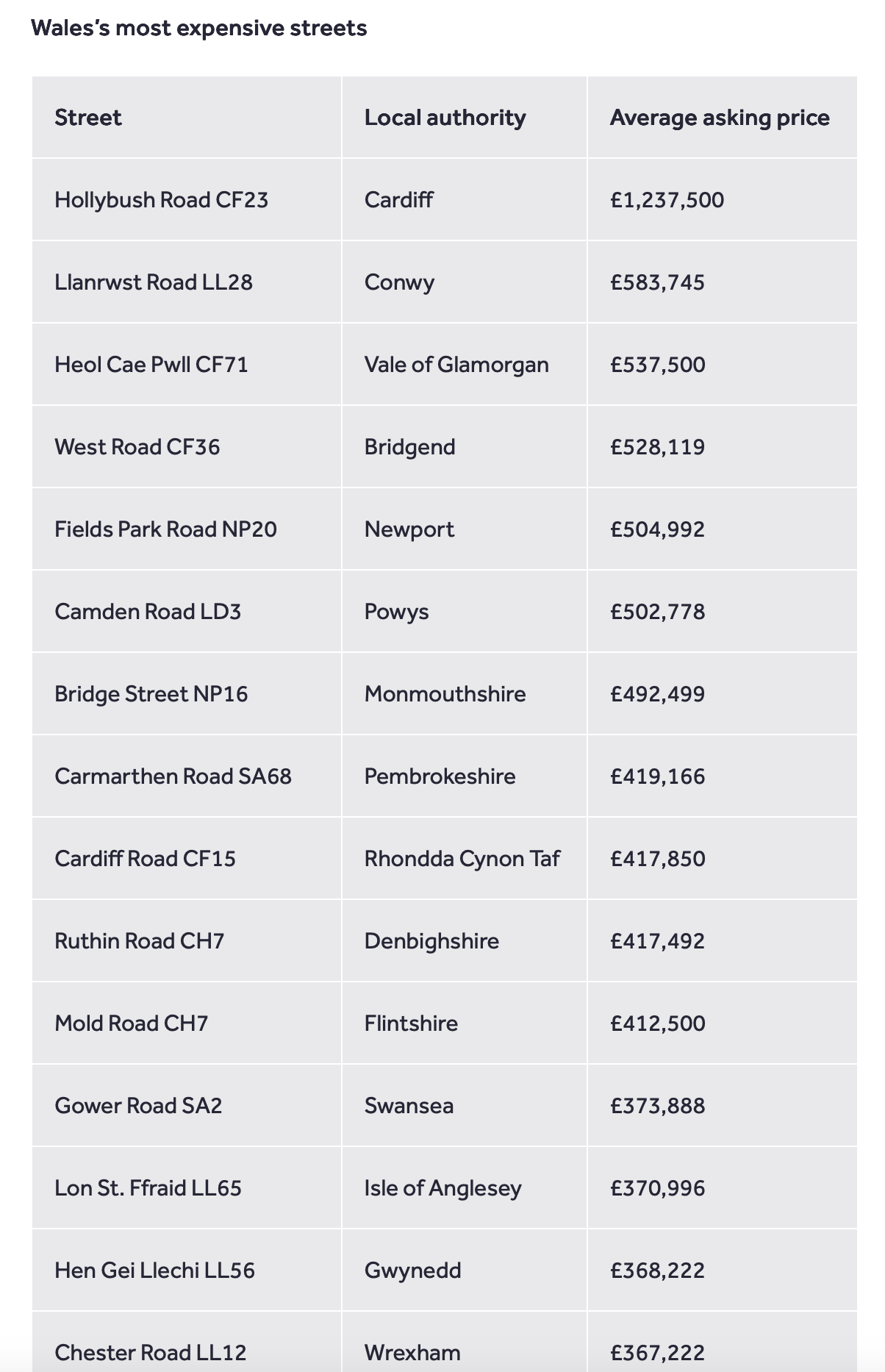 In first place was Hollybush Road in the CF23 postal area of Cardiff, which was named as the most expensive street in Wales, with an average price of £1,237,500.