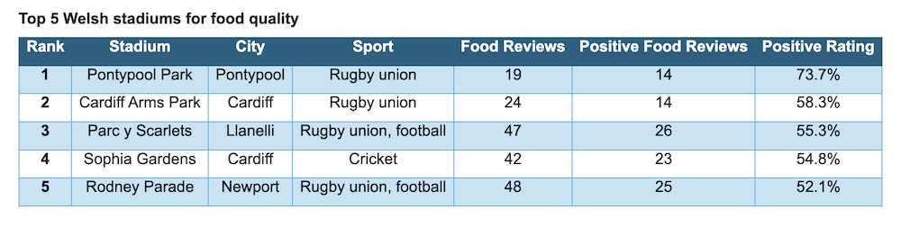 – Pontypool Park tops the list of Welsh stadiums for food quality, with 73.7% of food-related reviews being positive.
