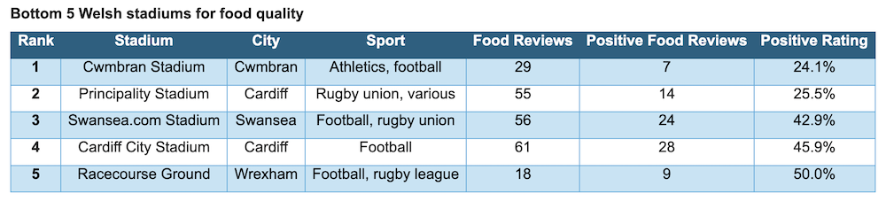 Cwmbran Stadium received the lowest ratings for food quality. The 10,500-capacity athletics and football venue had just 24.1% positive food reviews.