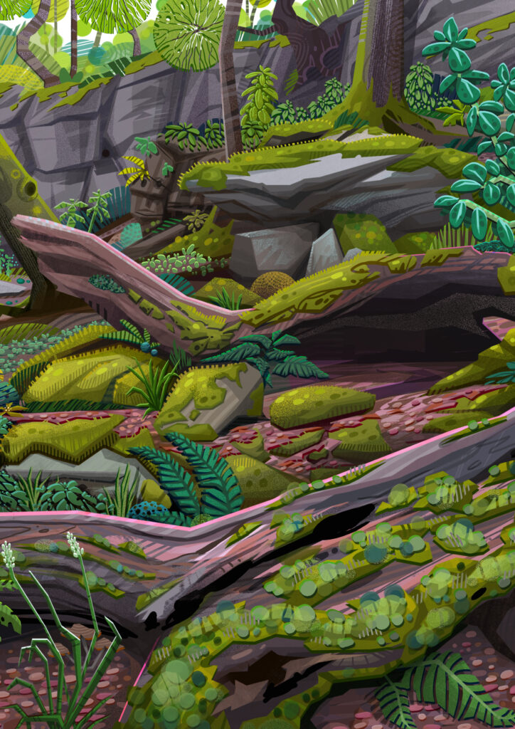 “I like to take inspiration from all the complexity of the natural world and bring that into photoshop where I simplify into distinct shapes that I can layer on top of each other to create an image, almost like building a collage in the digital space as much as it is drawing, and then I also look at the natural world around me for colour inspirations and how I can use it to capture a certain mood or atmosphere I want in that piece.