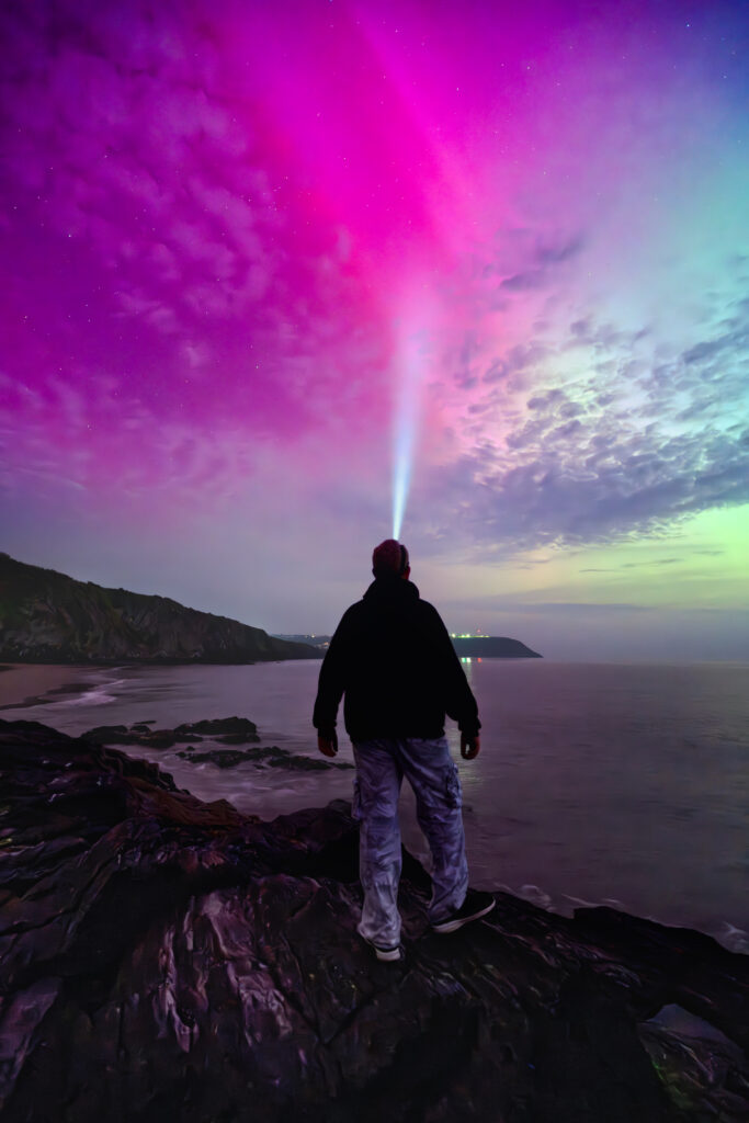 “I was overjoyed to capture this otherworldly Northern Lights display on the rugged Ceredigion coast of West Wales. The village of Llangrannog is not known for its celestial displays; it is better known for its beach, dramatic cliffs, and the statue of St. Crannog, who stands watch over the shoreline.