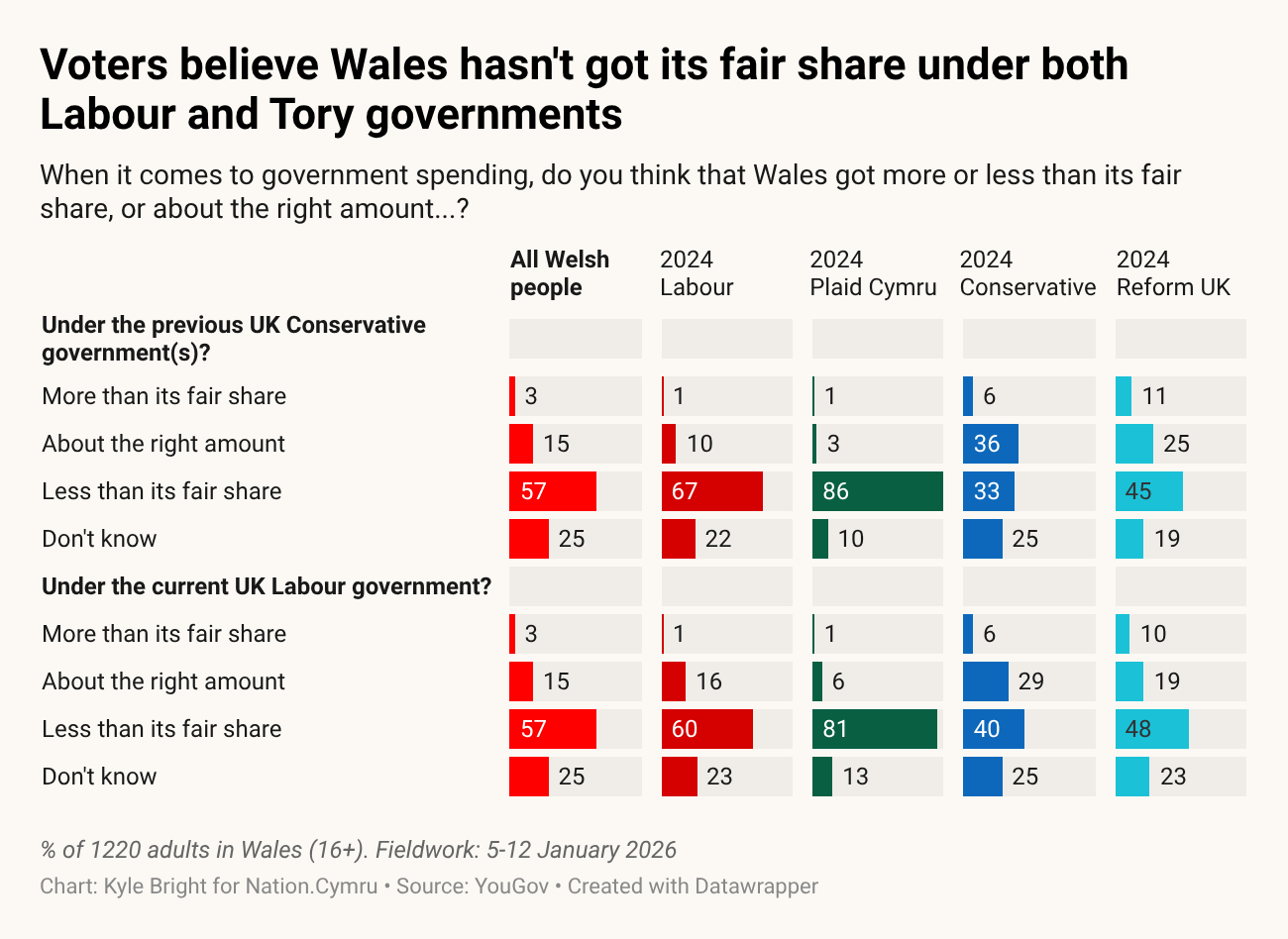 Importantly here, this belief hasn’t changed despite the arrival of a Labour government in Westminster in 2024 – in fact, the percentage who believe Wales is underfunded has remained identical (57%).