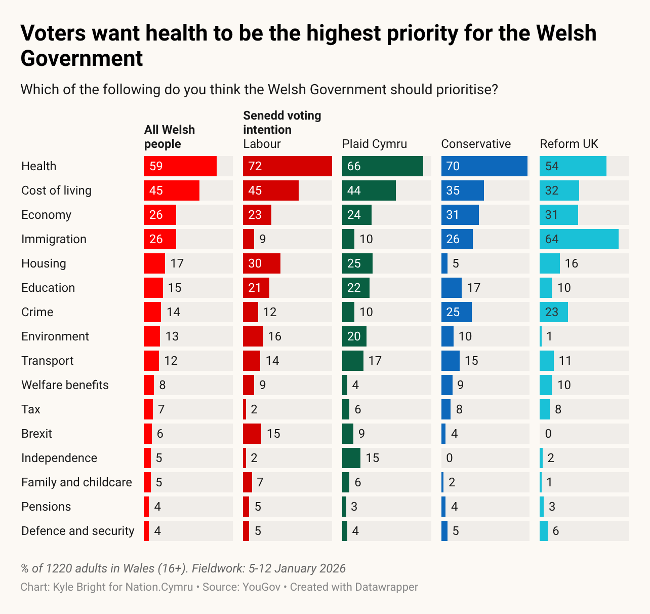 Turning to the issues that matter most to the Welsh people, and they’re very much bread-and-butter issues that affect the day-to-day lives of voters. Health takes top spot, followed by the cost of living and the economy.