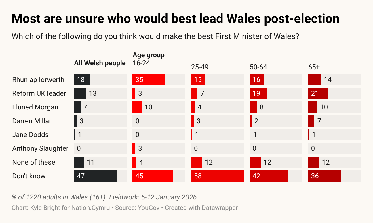 A notable exception among the oldest group of voters is that they are more willing to back an unknown Reform leader in Wales than any of the serving Welsh party leaders.