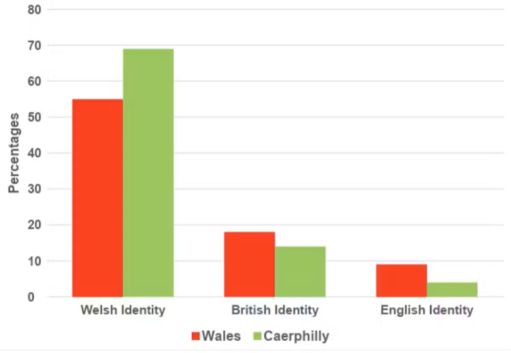 Some 55% of the population in Wales described themselves as Welsh in the census, but in Caerphilly it was 69% – a far higher figure. Equally, 18% described themselves as British in Wales but in Caerphilly it was 14%. Finally, 9% of the Welsh population described themselves as English, but only 4% of the population in Caerphilly did so.