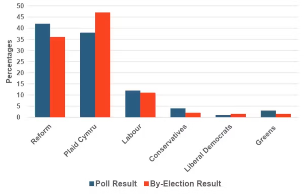 A Survation telephone poll published on October 16 suggested Plaid Cymru would come second with 38%, and the election would be won by Reform with 42%. The actual results after the October 23 vote were Plaid Cymru first on 47% and Reform second on 36%.