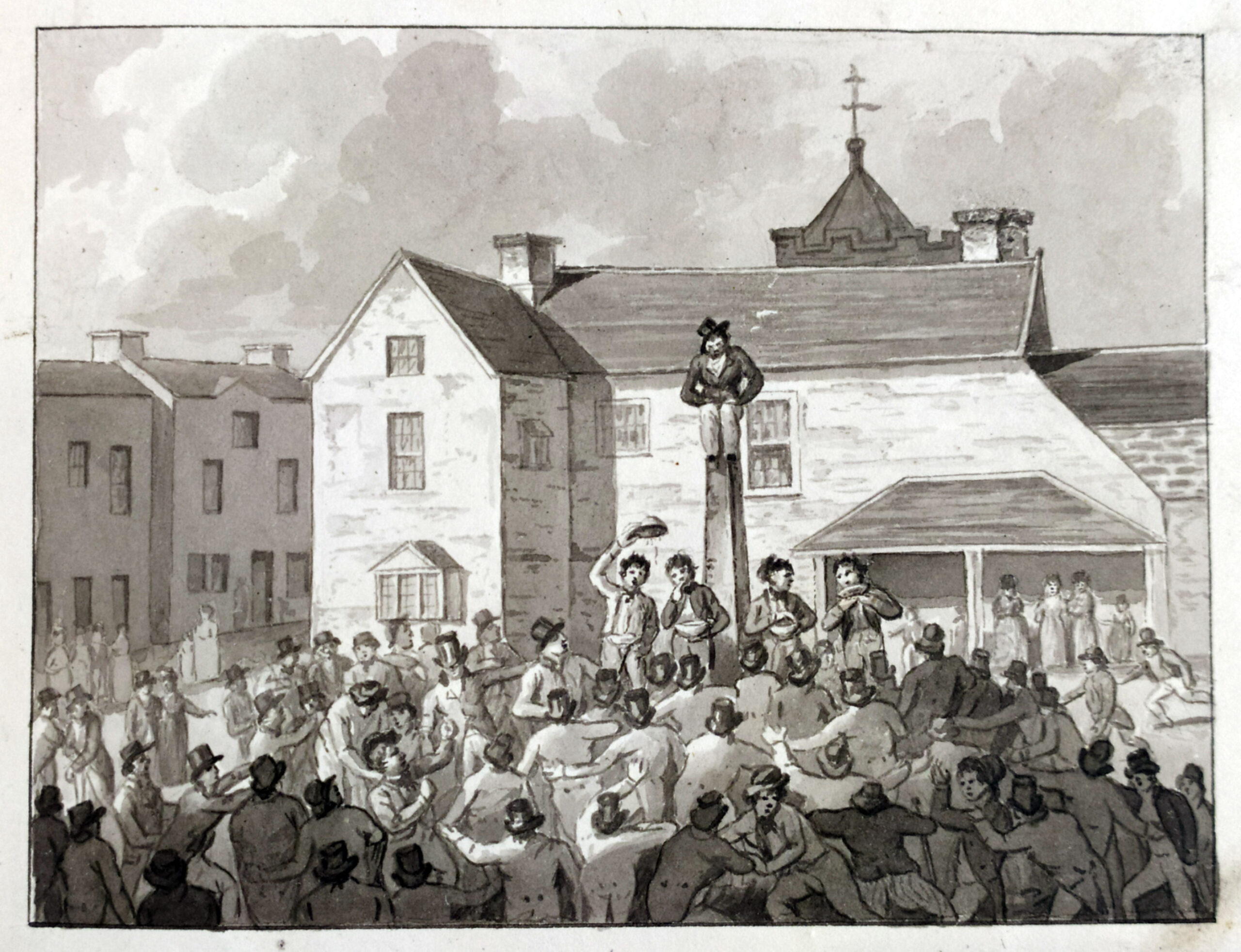 This is why he is the first character to appear in most surviving anterliwtiau. It is the fool’s job to attract the attention of the crowd. His practical function at the play’s start is to turn a mob of festival-goers into an audience, something we can see in anthropological terms as turning disorder into order, anti-structure into structure.