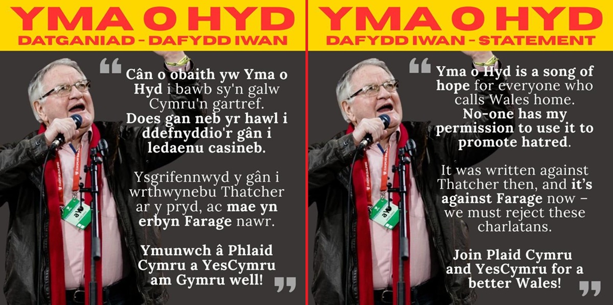 This is typical of these far-right scumbags. To use and abuse a legitimate protest song with a just message for their disgusting campaign of hate. It makes me both sick to the pit of my stomach and angry to think that these two secretions are tainting both Yma o Hyd and Y Ddraig Goch. I hope Dafydd Iwan sues the backside off these two pubic lice.