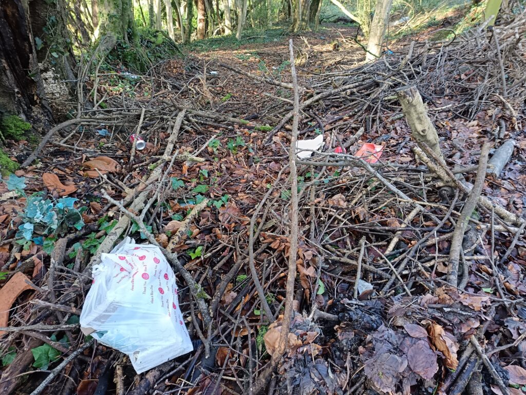 But where it narrows through a wooded area and the pavement ends empty bottles, cans and vapes are impossible to miss. There’s a battered umbrella, a green food waste caddy, and bags with rubbish in them.
