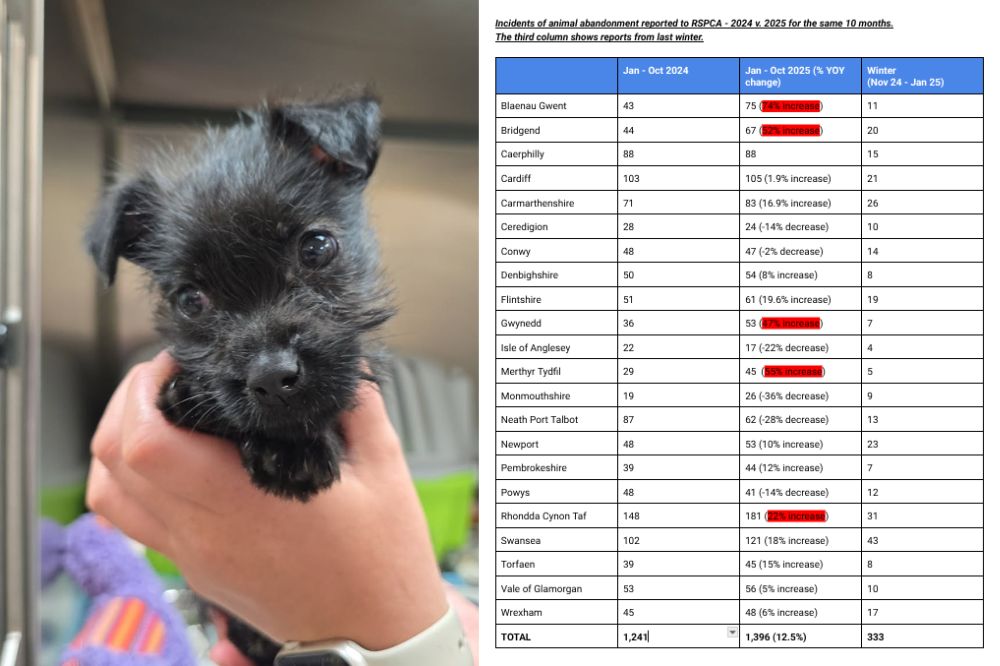 Up to the end of October, 1,396 incidents about an animal being abandoned or dumped had been raised with the charity’s emergency line in Wales – up from 1,241 in the first 10 months of 2024.