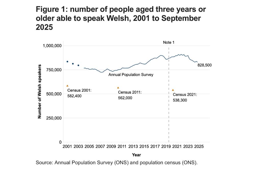 In the period since however, the last two years have seen a continued fall. According to the APS, there were an estimated 828,500 Welsh speakers living in Wales in the year ending 30 September 2025.