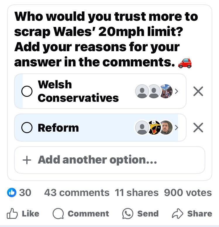 856 (over 95%) voted for Reform UK and only 44 (Less than 5%) said they would put their trust in the Welsh Conservatives to axe the speed restriction.