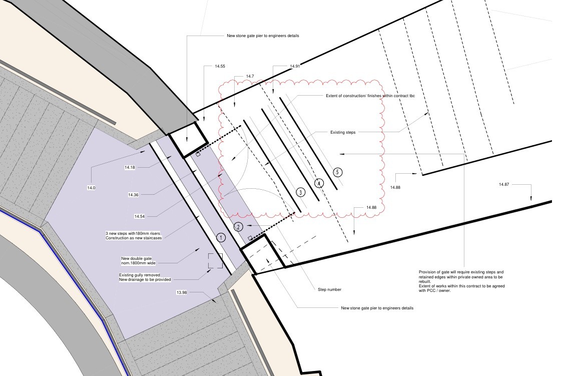 “The above will be replaced with a new stone gate piers which will interface with existing boundary wall and building to create a 1,900mm opening which will accommodate a 2,100mm steel galvanised powder coated gate which will be Umbra Grey in colour (RAL 7022) as well as the construction of three new access steps which replace the existing steps from Castle Back into the site.”