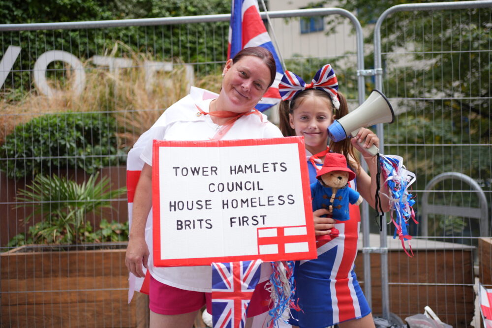 A woman carried a homemade banner which read: “Tower Hamlets council house homeless Brits first” which had a St George’s flag drawn on it.