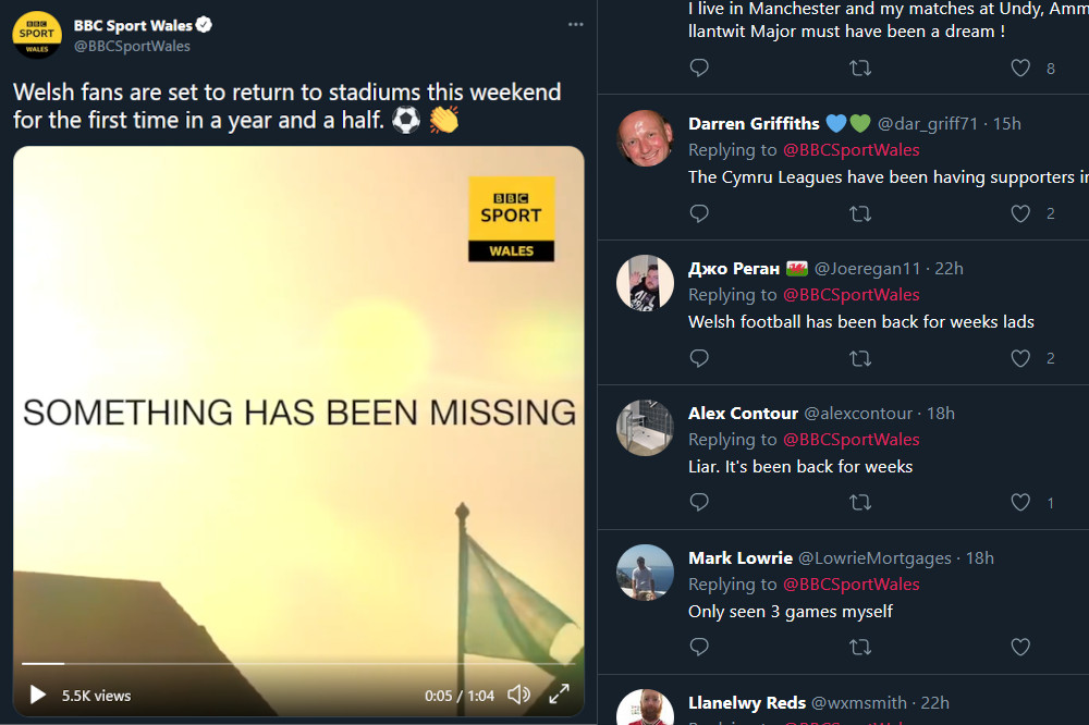 A BBC Sport Wales promotion that ‘welcomes back’ football fans to stadiums this weekend has been challenged for forgetting about the Welsh domestic league clubs.