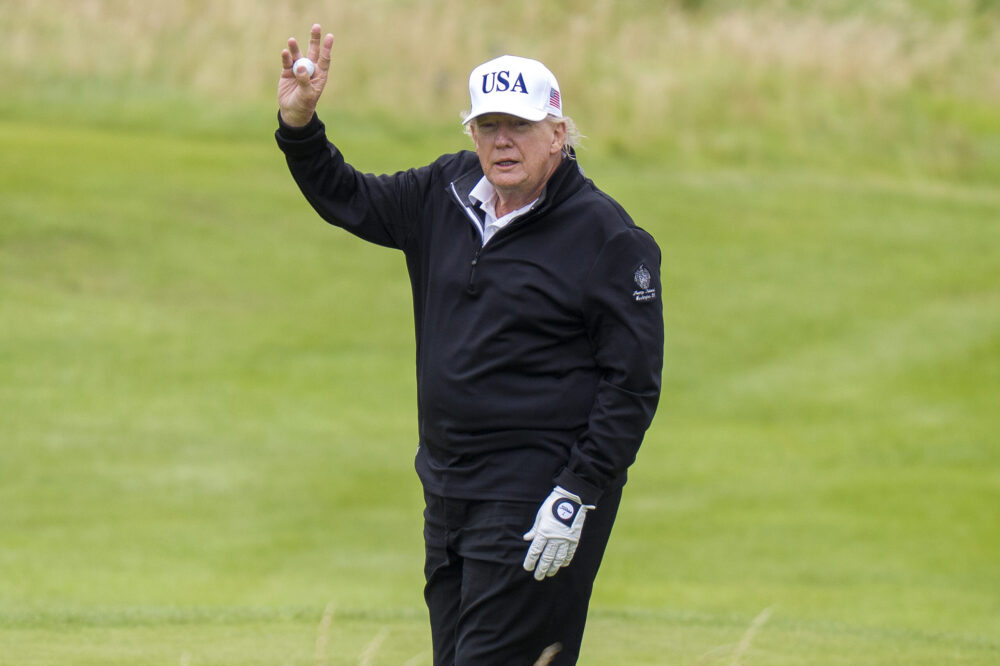 The Republican leader arrived around 11am at the coastal course in Ayrshire and played golf with his son, Eric.