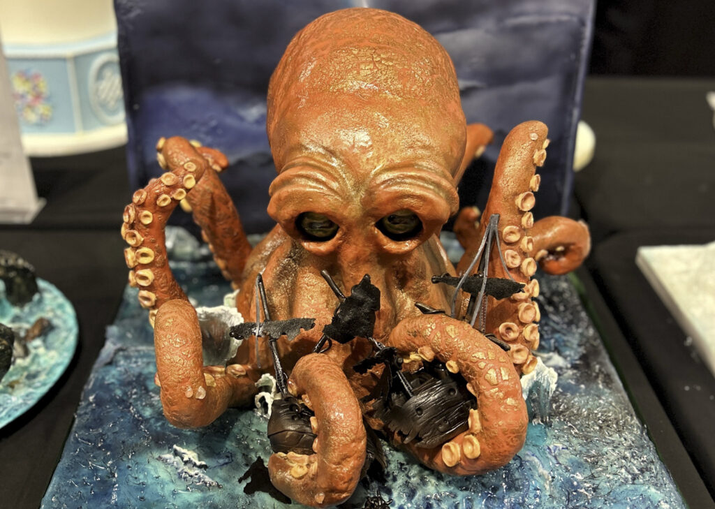 Award-winning cake designer Helen Searle-Jones, from Hope, in Flintshire, wowed judges at last year’s Cake International with her epic sea monster scene, showing a huge Kraken dragging Captain Jack Sparrrow’s Black Pearl pirate ship beneath the waves.