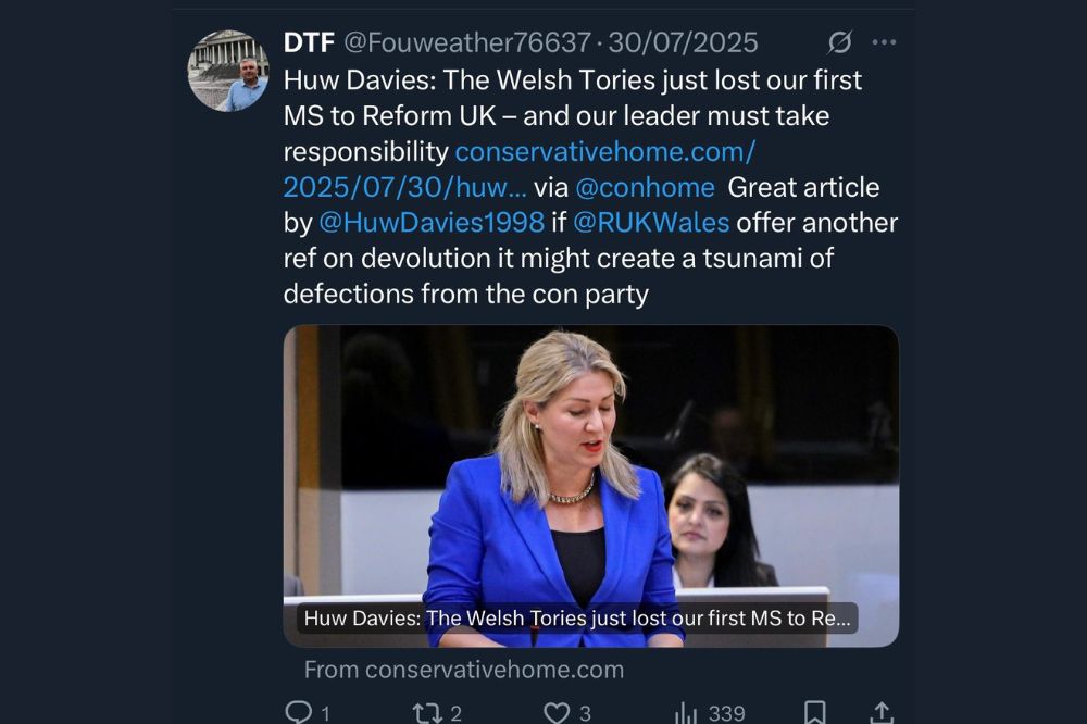 Fouweather wrote: “Great article by Huw Davies. If Reform UK offer another referendum on devolution it might create a tsunami of defections from the con party.”