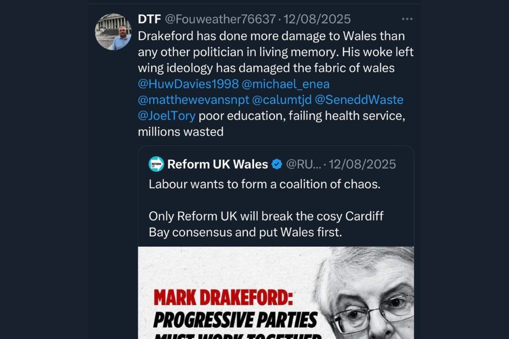 In August, the Chairman of the Newport and Islwyn Conservative Federation shared another post by Reform Councillor David Thomas which stated, “Reform UK is the real opposition in Wales.”