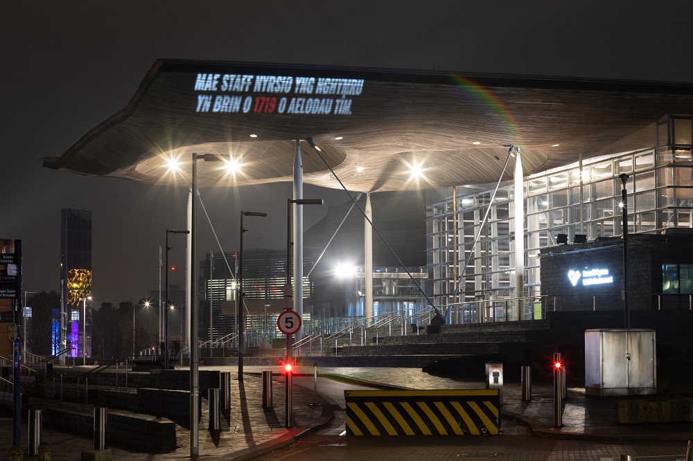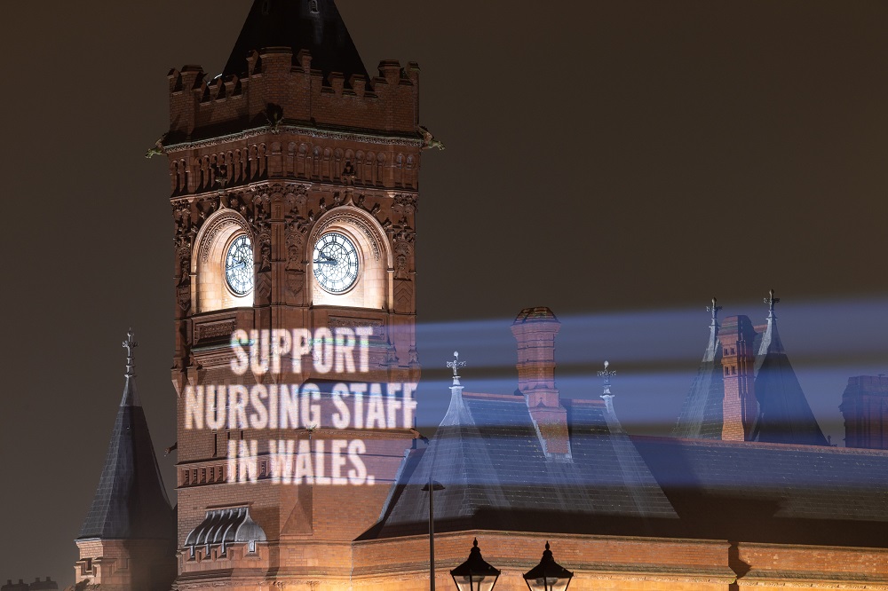 A new campaign by the Royal College of Nursing Wales (RCN), projected a direct message to the Welsh Government on iconic buildings across Cardiff tonight.