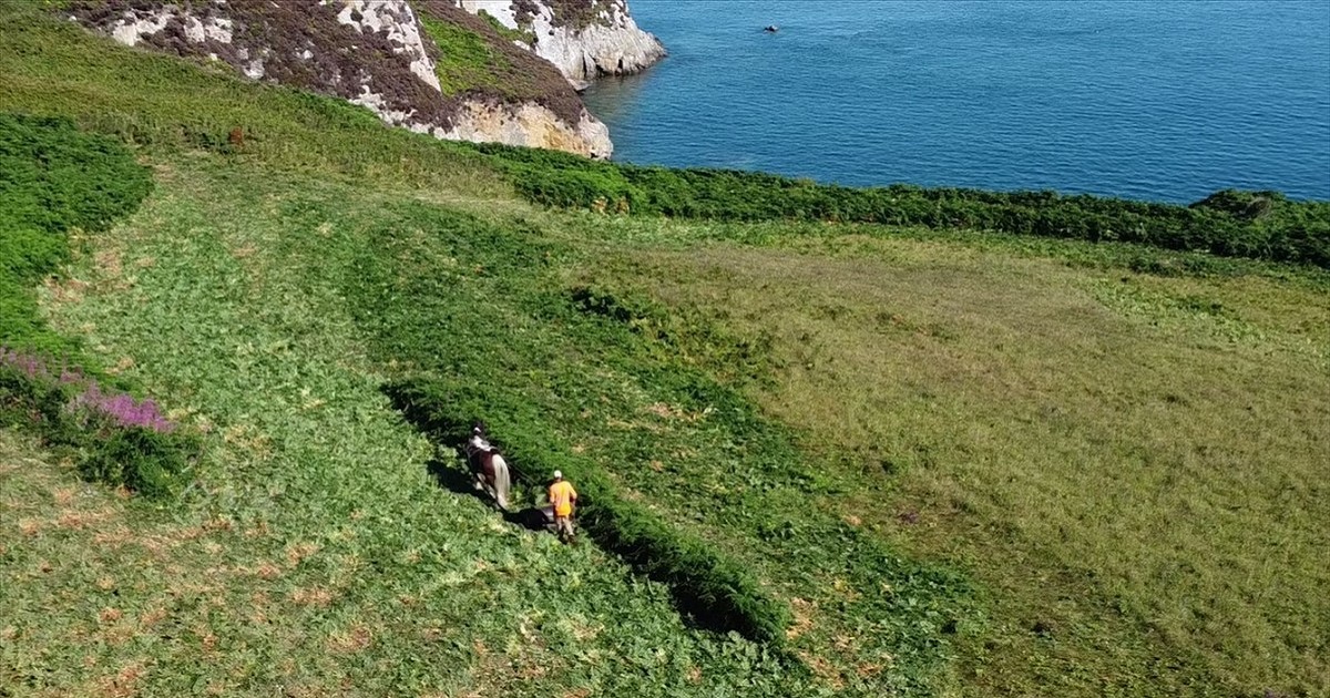 The pair’s latest work has been at the council-run Holyhead Breakwater Country Park. The traditional horse-drawn farming method sees the reduction of the scrub land plant by a roller crushing the stems – a technique favoured over cutting which can stimulate growth.