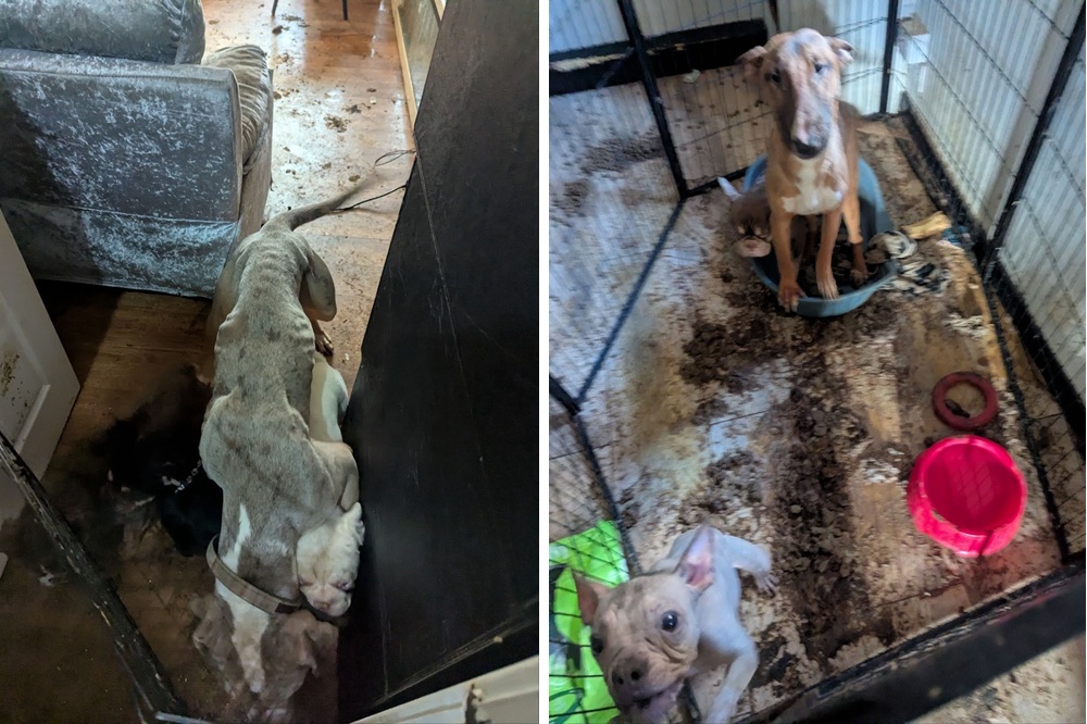 Outside, two collie-type dogs were found in a yard covered in mud and faeces, with no clean resting area. One was lying on a pile of dry dog food by the back door, described as the only dry spot available.
