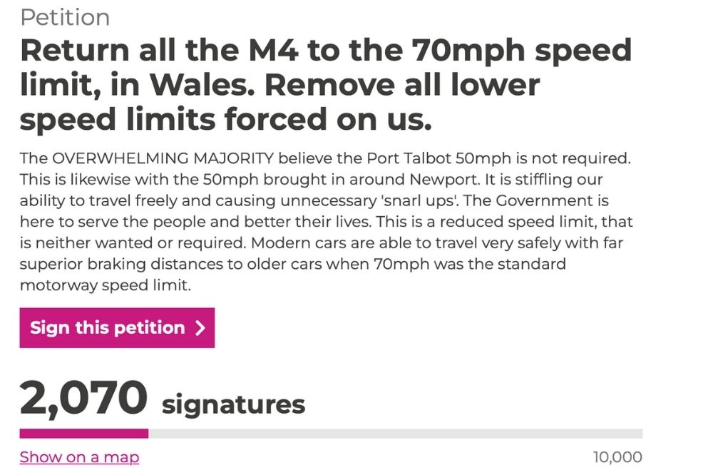 The petition, titled “Return all the M4 to the 70mph speed limit, in Wales. Remove all lower speed limits forced on us”, urges the Welsh Government to scrap reduced speed limits on the motorway and re-instate the national speed limit across the entire route.