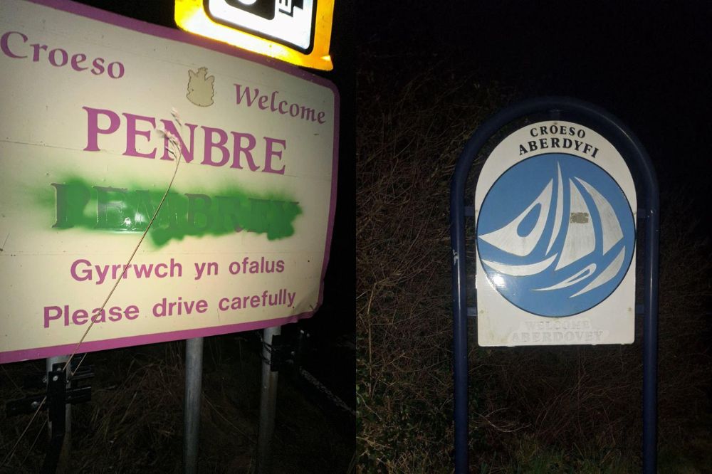 The incidents occurred mostly overnight on signs for Y Trallwng (Welshpool), Porth Tywyn (Burry Port), Aberteifi (Cardigan), Caerfyrddin (Carmarthen), Cydweli (Kidwelly), Penbre (Pembrey) and Aberdyfi (Aberdovey) although more locations are believed to have been targeted including in Flinthshire.