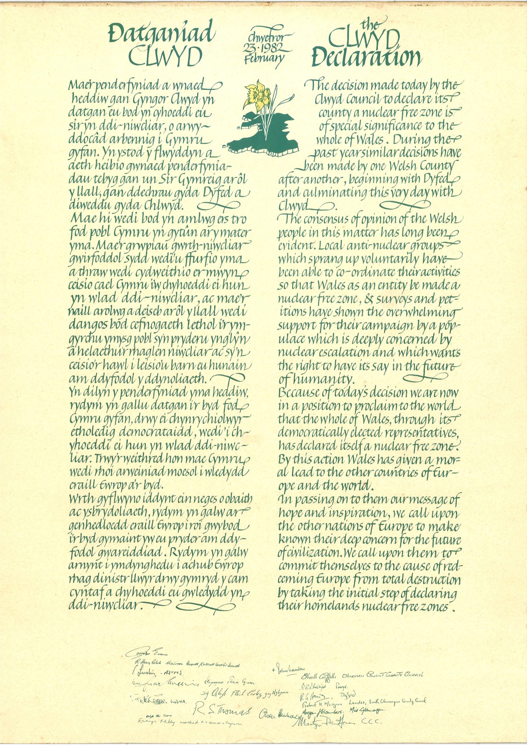 The Nuclear Free Wales Declaration emphasised that the whole of Wales was declared a nuclear-free zone, and that the people of Wales wished to live in peace without the threat of nuclear war.