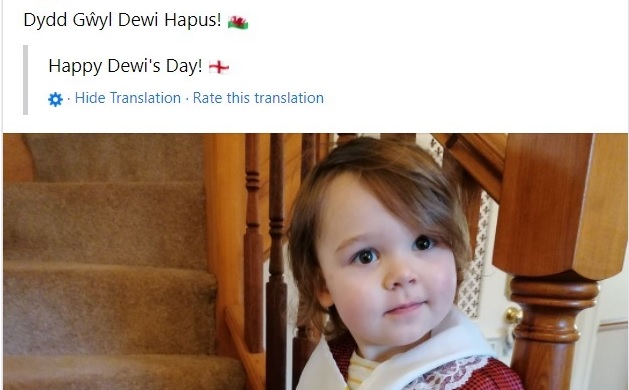 The site is translating ‘Dydd Gŵyl Dewi Hapus’ followed by a Welsh flag emoji into Happy Dewi’s Dy followed by an English flag emoji.