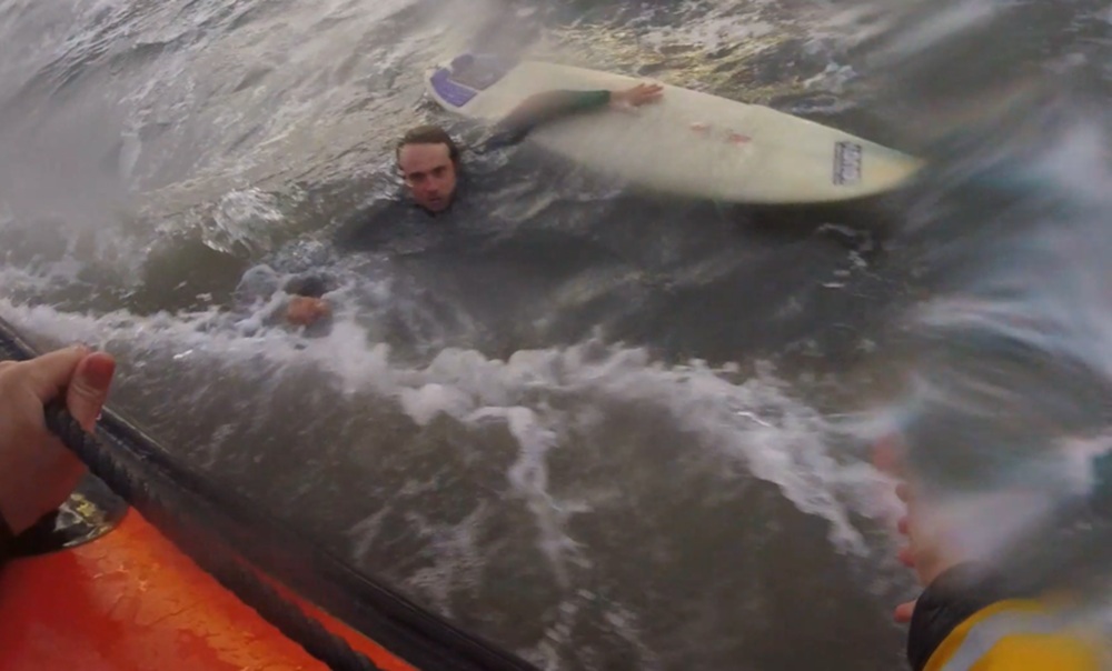 Footage has been released showing the dramatic rescue of a surfer stranded in choppy waters and gale-force winds after getting dragged out to sea by a powerful rip current.