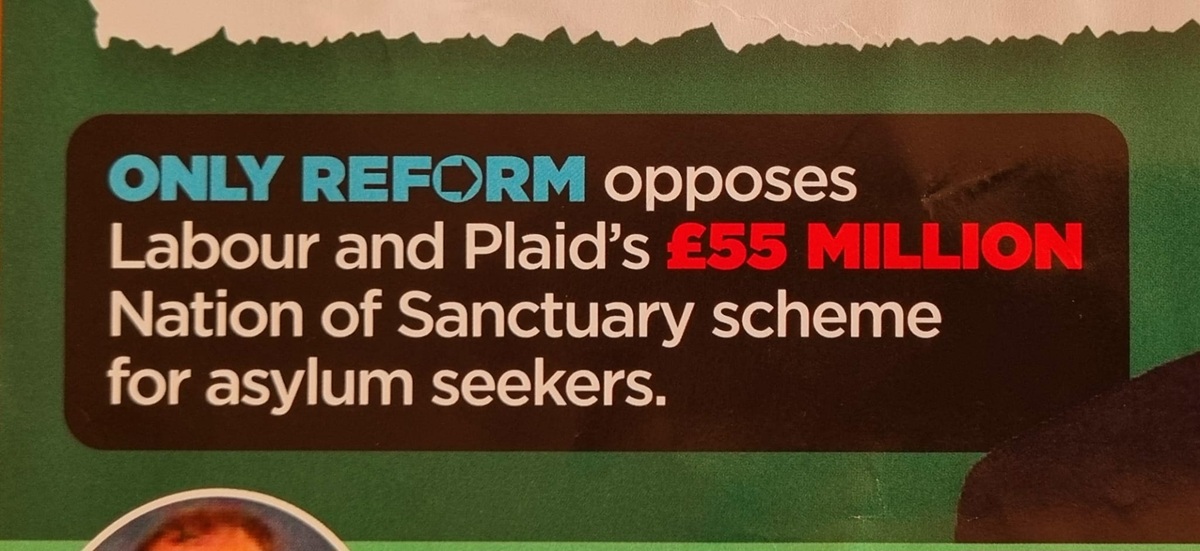 This week Reform has been distributing a leaflet in the constituency which states: “Only Reform opposes Labour and Plaid’s £55 million Nation of Sanctuary scheme for asylum seekers.”