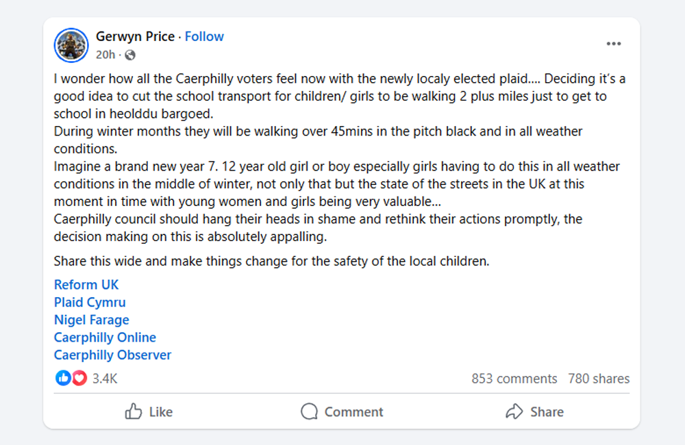 In the Facebook post, Price says he “wonders how all the Caerphilly voters feel now with the newly locally elected Plaid”, blaming the party for cuts by the local council which will take away free transport for pupils within two miles of their secondary school.