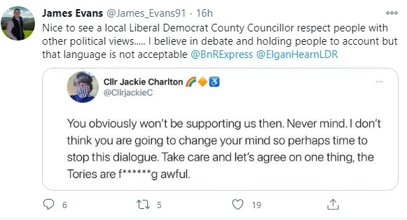 She apologies last month after Cllr James Evans, the prospective Conservative Senedd election candidate for Brecon and Radnorshire, picked up on her tweet about the Conservative.