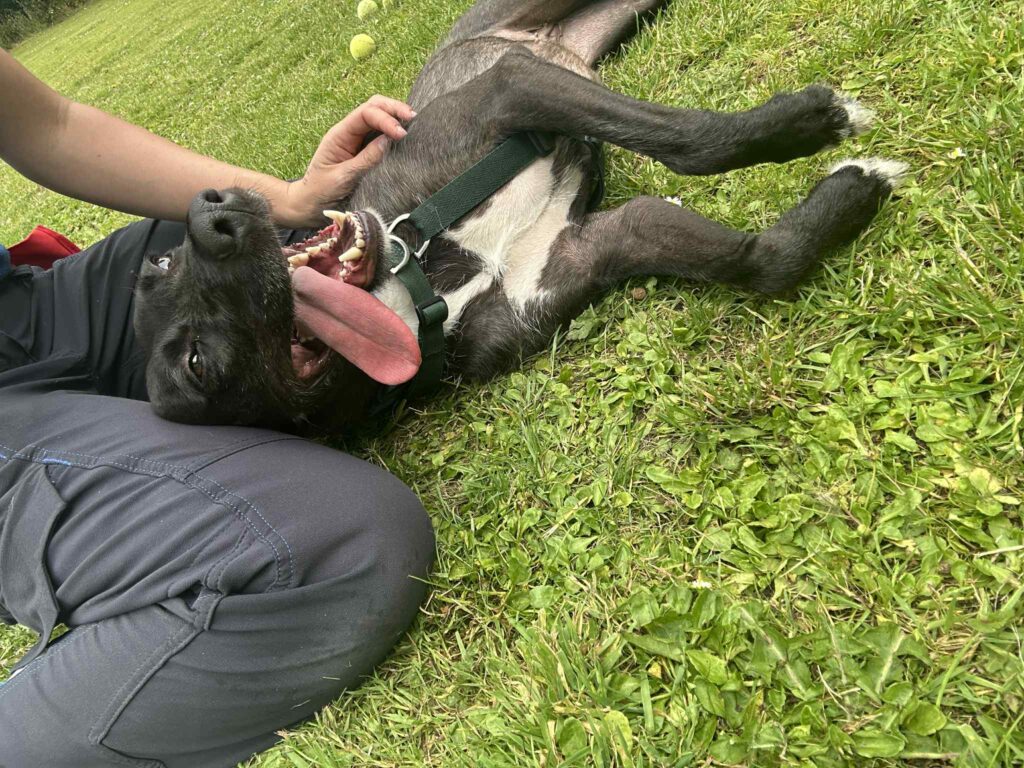 “Maya is a friendly and affectionate girl who enjoys meeting new people,” said Sara. “She adores a zoomie and would benefit from a secure garden with six-foot fencing to race around. Maya is a silly girl and loves chasing her toys in our fields – however she also does walk well on a lead and is fitted with a secure harness.”