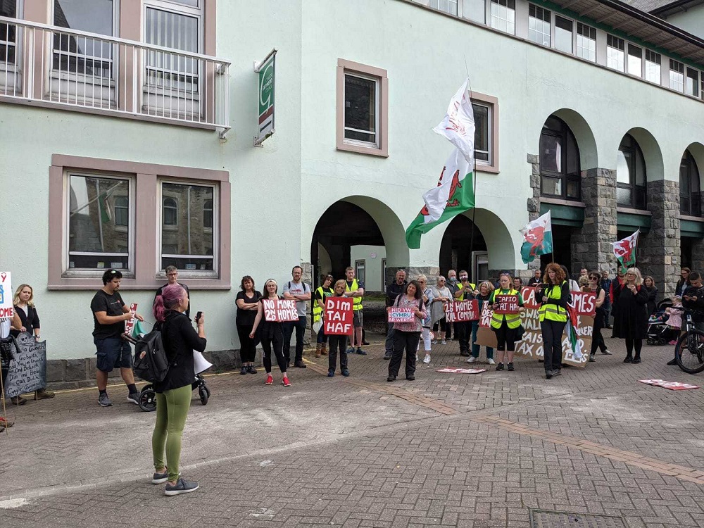 At a demonstration outside the council’s headquarters, also attended by Liz Saville Roberts MP, group spokesman Rhys Tudur demanded “immediate action,” claiming that anything less would further weaken the language in its traditional heartlands.