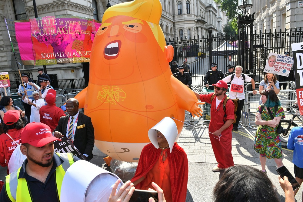 Other inventive creations by protesters in 2019 included a 16ft talking robot of Mr Trump sitting on a gold toilet, which said the phrases “No collusion”, “You are fake news” and “I’m a very stable genius” in audio of Mr Trump’s own voice; and Handmaids Against Trump – women draped in red with white hoods in homage to Margaret Atwood’s dystopian novel about a crackdown on reproductive rights.