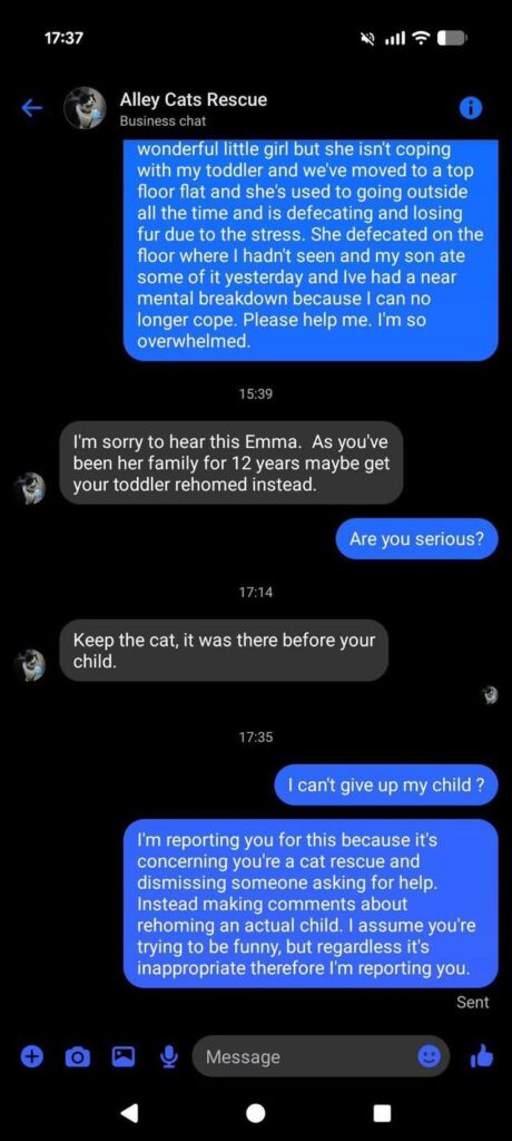 Other Porth residents have since shared their experiences with the centre, with one writing: “I’ve just been blocked by Alley Cats Rescue for sharing a screenshot I found of the rescue telling a young woman to “rehome her toddler” instead of her cat when she reached out to ask for help.”