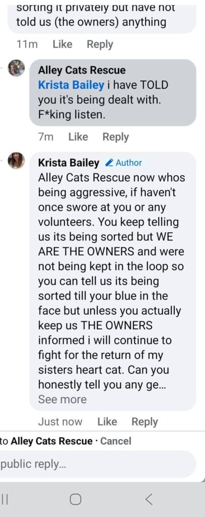 “Anybody who is concerned for the welfare of the cats, please by all means visit us by appointment. I can talk you through the care that each cat is receiving, and you will be able to see the reality of the conditions at Alley Cats Rescue. The comments on Facebook are getting out of hand, and no one is seeing the reality.
